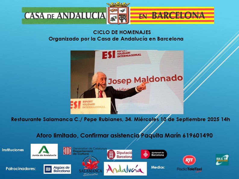 La próxima comida homenaje que organizará la Casa de Andalucía en Barcelona tendrá como protagonista al político catalán Josep Maldonado. La comida tendrá lugar el 10 de septiembre como siempre en el Restaurante Salamanca de la Barceloneta. Interesado llamar a Paquita Marín, 619 601 490.